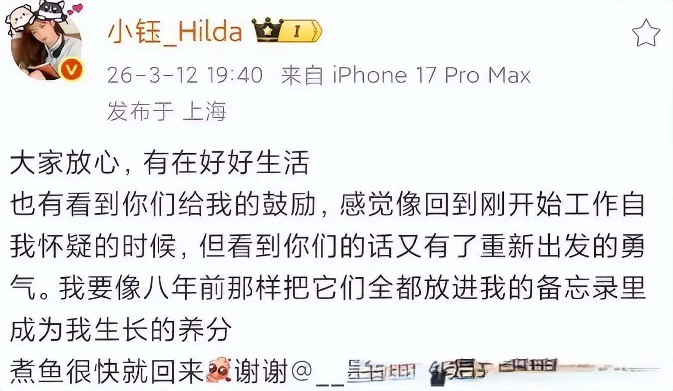 在舆论不断发酵的情况下,小钰也终于在社交平台发布了一段文字,首次正面回应这场分手风波,她表示自己“有在好好生活”,也看到了很多网友给予的鼓励和安慰,她提到,这段时间的感受让自己想起刚进入行业时的那段迷茫阶段,当时同样经历过自我怀疑,但最终还是依靠外界的支持重新找回动力,如今,她也希望把这些经历记录下来,像八年前那样放进备忘录里,当作未来成长的养分。