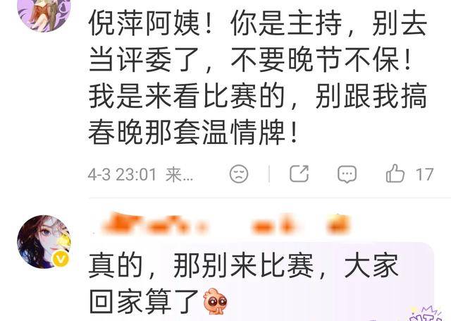 有人喊“代斯”、“黑幕”,弹幕刷屏“评委耳朵聋了”,网友们更是气得不行,直接发起“淘汰倪萍杜华”的话题,吐槽她“将竞技舞台变成人情调解现场”。